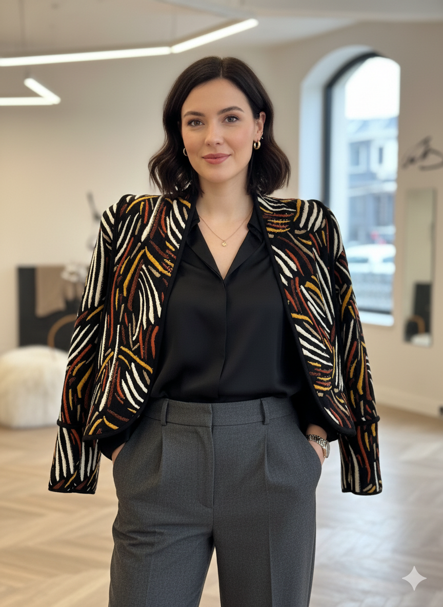 Make a bold statement with this unique zebra-print jacket, combining standout style with modern tailoring for an effortlessly chic look.